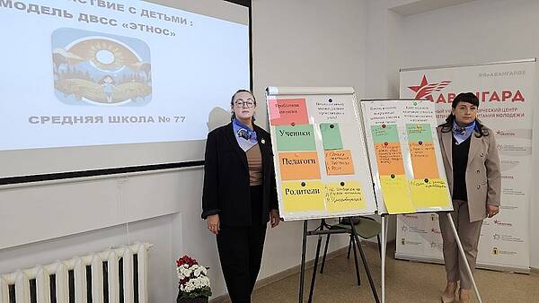 Педагоги школы Стопина Ольга Александровна, Дубова Ксения Алексеевна, Алфеева Наталья Александровна провели мастер-класс для молодых педагогов и их наставников «Взаимодействие с детьми мигрантов: модель ДВСС «Этнос».