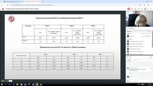 Страхова Наталья Вячеславовна, доцент КОО, кандидат исторических наук привела и обобщила сведения о количестве участников ОГЭ по обществознанию, динамике результатов с 2023-2025 годы, критериях оценивания заданий и уровню их выполнения учащимися.